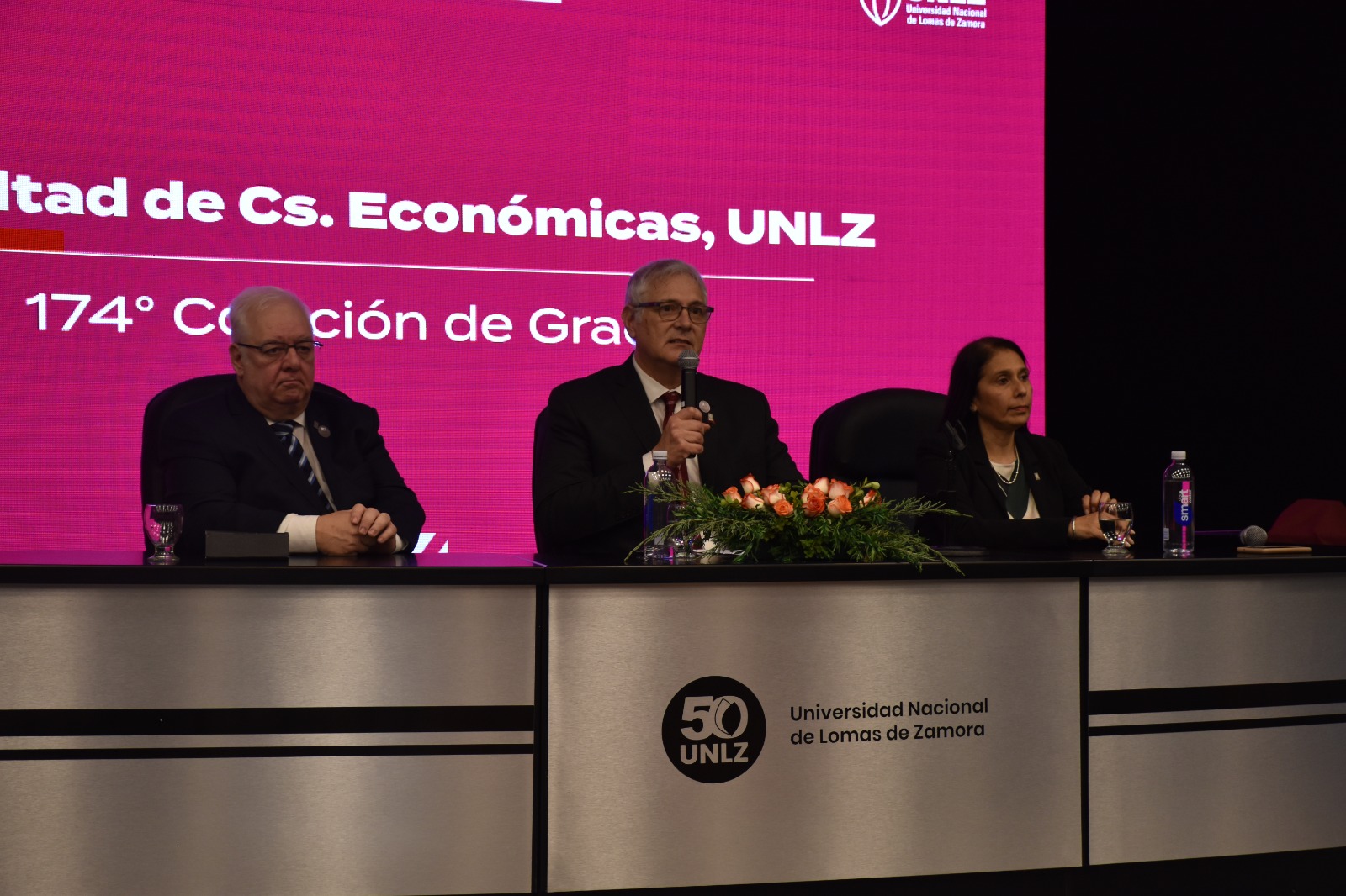 El miércoles 29 de mayo se llevó a cabo una nueva Colación de Grado, la 174. Un total de 96 nuevos graduados recibieron sus respectivos títulos de Contadores Públicos y Licenciados en Administración. El acto estuvo encabezado por el Decano de la Facultad de Ciencias Económicas, Magister Gabriel Franchignoni; acompañado por el Vicerrector de la UNLZ, Magíster Alejandro Kuruc; y la Secretaria Académica de la Facultad, Magíster Norma Salvatierra.